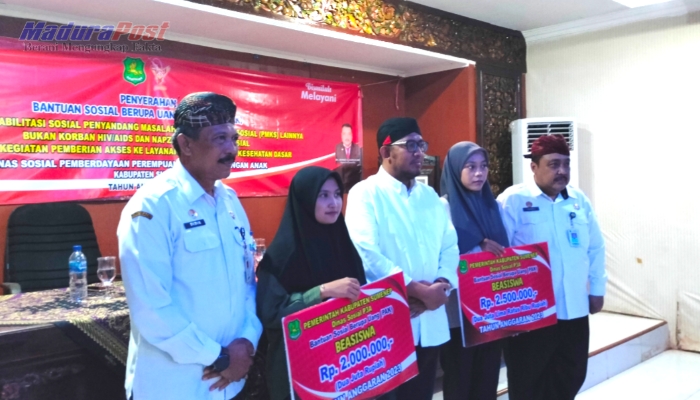 BANTUAN. Potret bantuan beasiswa untuk mahasiswa aktif yang disalurkan Pemkab Sumenep melalui Dinsos P3A setempat di akhir tahun 2023 lalu. (M.Hendra.E/MaduraPost)