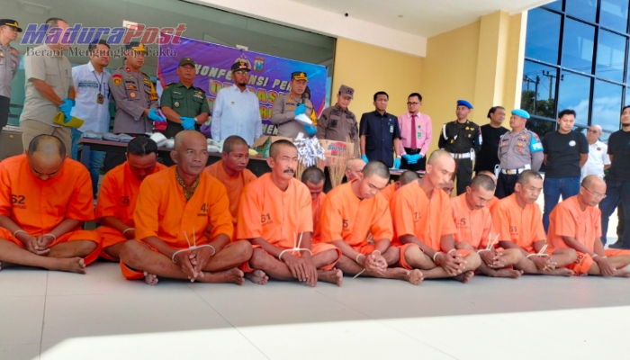 UNGKAP KASUS. Potret belasan tersangka dari kasus yang berbeda diungkap Polres Sumenep bersama awak media dalam jumpa pers. (M.Hendra.E/MaduraPost)