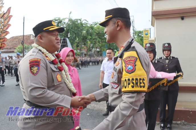 PAMEKASAN, MaduraPost – Serah terima Jabatan Kapolres Pamekasan dari AKBP Satria Permana kepada AKBP Jazuli Dani Iriawan berlangsung di Lapangan Olahraga Sarja Arya Racana Polres Pamekasan, Senin (18/12/2023) pagi.