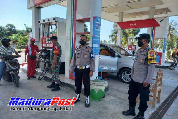 Personel Polres dan Kodim 0827 Sumenep saat melakukan pengamanan di sejumlah SPBU yang ada di kabupaten setempat. (Istimewa for MaduraPost)