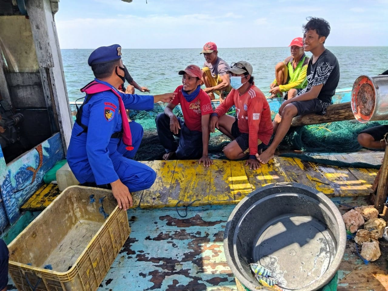 Keterangan Foto : Kasat Polairud Polres Sampang (Iptu Catur Rahardjo SH) Saat berada di atas kapal dan memberikan himbauan kepada para nelayan