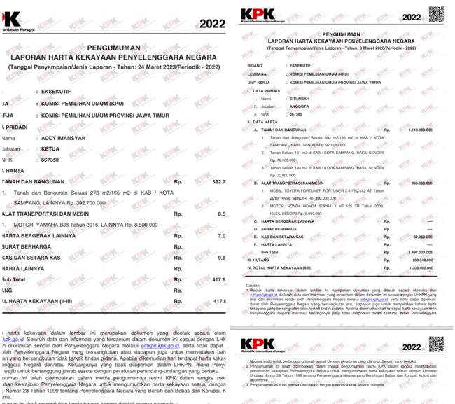 Berikut daftar harta kekayaan lima anggota KPU Kabupaten Sampang berdasarkan Laporan Harta Kekayaan Penyelenggara Negara (LHKPN) yang diserahkan ke KPK: