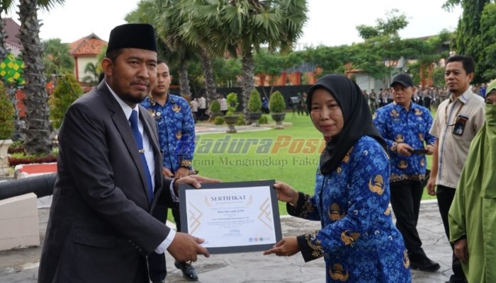 SUMENEP, MaduraPost – Pada momentum Hari Pendidikan Nasional (Hardiknas) 2023, Bupati Sumenep Achmad Fauzi memberikan apresiasi dan penghargaan kepada Anis Nur Laili, Guru SDN Bakeong II Kecamatan Guluk-guluk. Selasa, 2 Mei 2023.