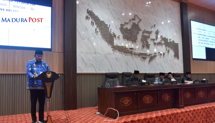 SAMBUTAN. Potret Bupati Achmad Fauzi Wongsojudo, saat menyampaikan sambutan dalam Rapat Paripurna DPRD Sumenep terkait pembahasan dua Raperda, Senin (17/3/2025). (Istimewa for MaduraPost)