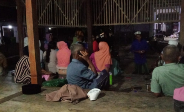 Sekitar pukul 20.30 WIB, warga dan keluarga korban bergotong royong memadamkan api dengan alat seadanya.