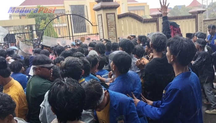 Adu jotos antara mahasiswa dan personel Polres Sumenep tak terelakkan di tengah guyuran hujan.