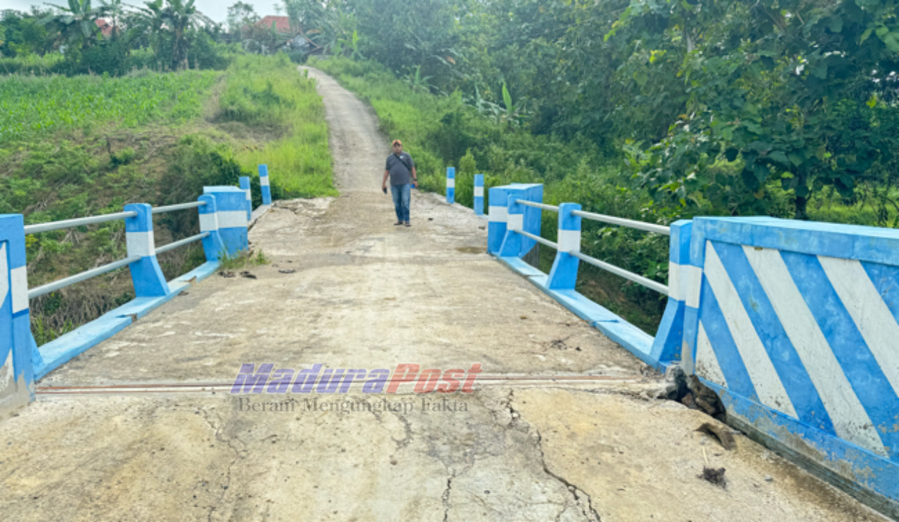Memprihatinkan ! Kondisi jembatan yang berada di Dusun Ganbillah Desa Tobai Tengah Sampang yang dikerjakan dengan proyek pokir rusak parah dan ambruk (foto : Imron Muslim/MaduraPost).
