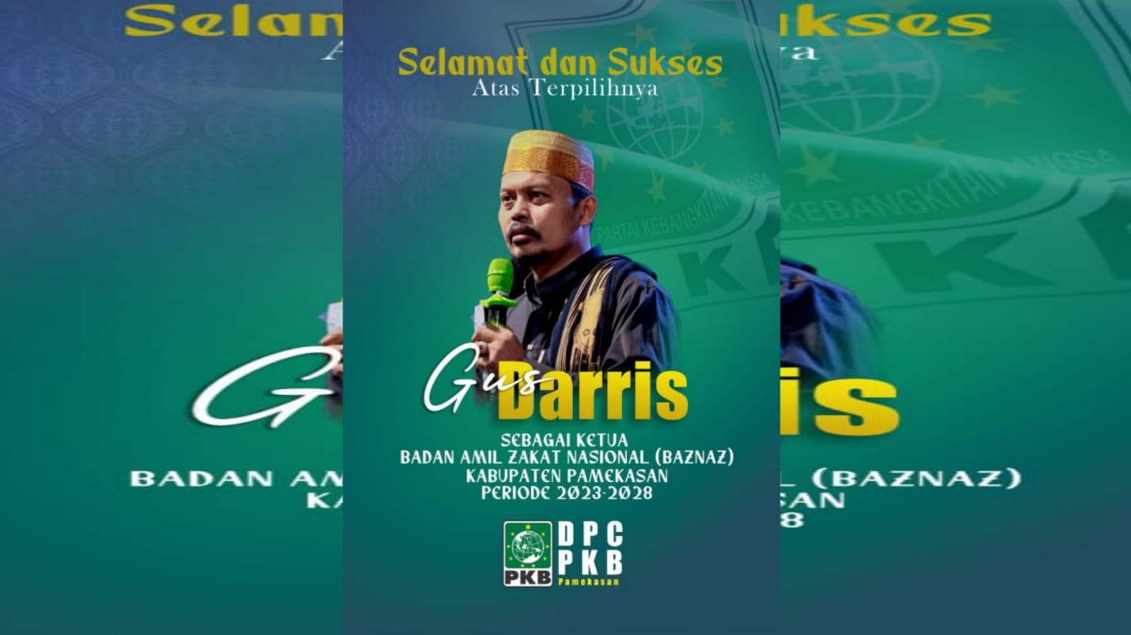 Pamflet ucapan selamat dan sukses dari Partai Kebangkitan Bangsa (PKB) kepada Gus Darris yang terpilih jadi Ketua Baznas Pamekasan (Mohammad Munir)