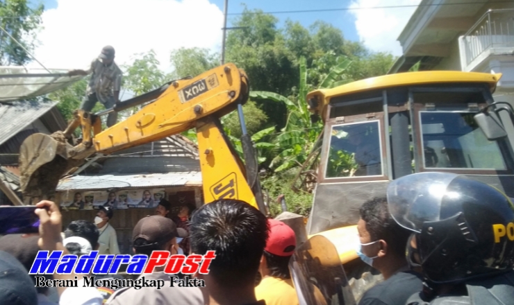 Alat berat terus beraktivitas sebagaimana arahan dan perintah Pengadilan Negeri (PN) Pamekasan. Setelah berhasil meratakan toko bangunan itu dengan tanah, PN lalu memberi papan informasi pengadilan.