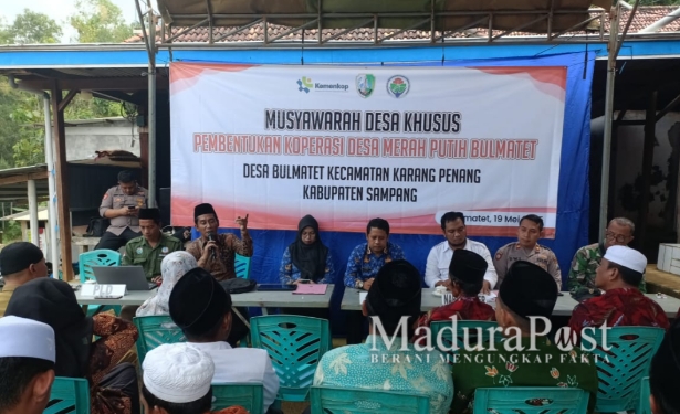 SAMPANG, MaduraPost – Dalam rangka memperkuat kemandirian ekonomi desa, Pemerintah Desa (Pemdes) Bulmatet, Kecamatan Karang Penang, Kabupaten Sampang menggelar Musyawarah Desa Khusus (Musdesus) untuk pembentukan Koperasi “Desa Merah Putih”, Senin (19/5/2025).