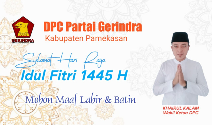 PAMEKASAN, MaduraPost – Dewan Pimpinan Cabang (DPC) Partai Gerindra Kabupaten Pamekasan mengucapkan Selamat Hari Raya Idhul Fitri 1445 Hijriyah.