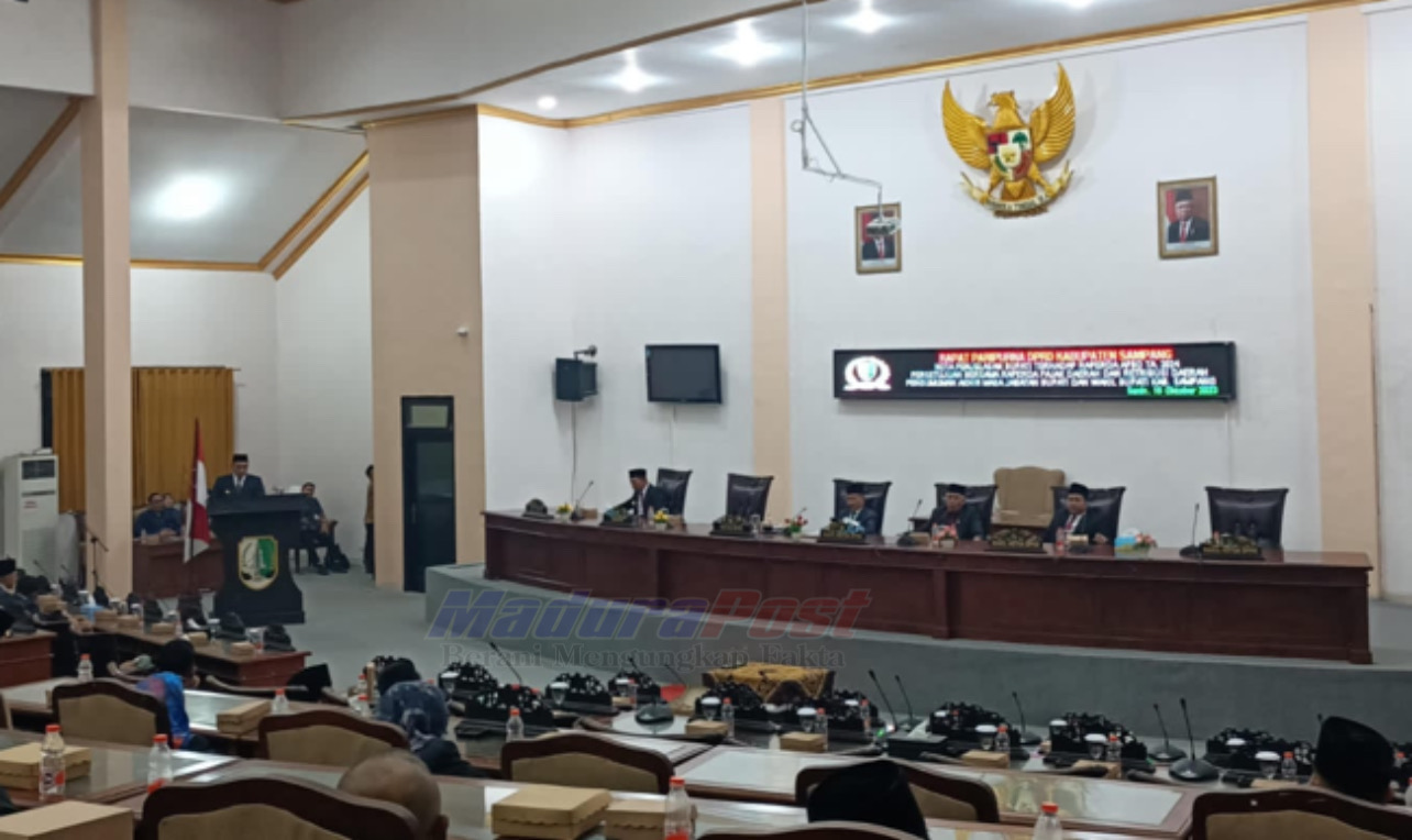 SAMPANG, MaduraPost – Dewan Perwakilan Rakyat Daerah (DPRD) Kabupaten Sampang, Madura, menggelar rapat paripurna terkait nota penjelasan Bupati Sampang terhadap Raperda Anggaran Pendapatan dan Belanja Daerah (APBD) tahun anggaran 2024 serta pengumuman akhir masa jabatan Bupati dan Wakil Bupati Sampang periode 2019-2024. Senin (16/10/2023).