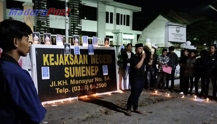Di depan Kantor Kejari Sumenep, massa aksi menempelkan foto mendiang Zainol Hayat. Ada puluhan lilin yang dihidupkan hingga doa tahlil bersama dilakukan.