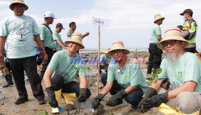 SUMENEP, MaduraPost – Bupati Sumenep Achmad Fauzi melakukan giat penanaman dan edukasi mangrove di wisata Pantai Matahari Desa Lobuk, Kecamatan Bluto, Kabupaten Sumenep, Madura, Jawa Timur. Minggu, 6 Agustus 2023.
