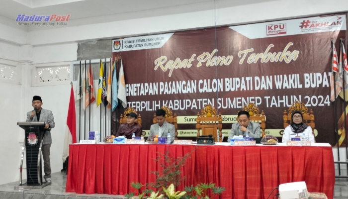SUMENEP, MaduraPost – Komisi Pemilihan Umum (KPU) Kabupaten Sumenep, Madura, Jawa Timur, menggelar rapat pleno terbuka untuk menetapkan pasangan calon Bupati dan Wakil Bupati Terpilih Kabupaten Sumenep Tahun 2024.