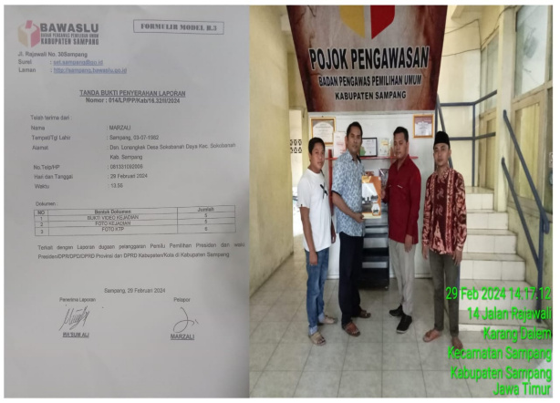 Laporan LSM Komando HAM diterima oleh Staf Bawaslu Kabupaten Sampang Ma’sum Ali yang didampingi Ketua Komisioner Bawaslu Muhally, LSM Komando HAM menyerahkan bukti-bukti foto dan video untuk dikaji langsung oleh pihak Bawaslu.
