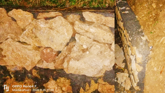 Pantauan Wartawan MaduraPost di lokasi, nampak jelas susunan batu dinding saluran air pada proyek tersebut hanya satu baris, tataan batunya ditata tanpa adukan (campuran semen dan pasir) dan batunya ditata berdiri.