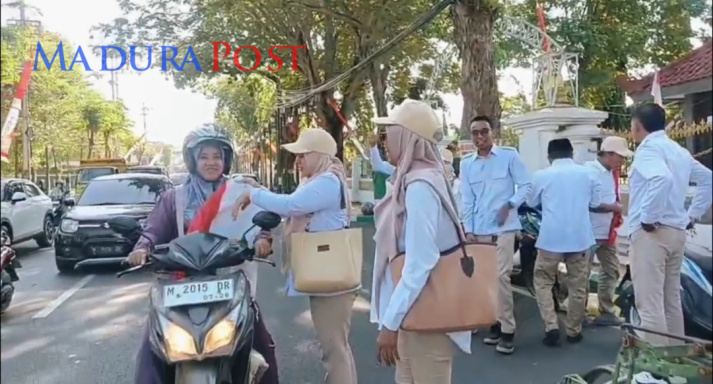Bendera merah putih diberikan kepada pengendara roda dua dan roda empat, termasuk abang becak yang melintas di Jl.Diponogoro, Area Monomen Arek Lancor Pamekasan.
