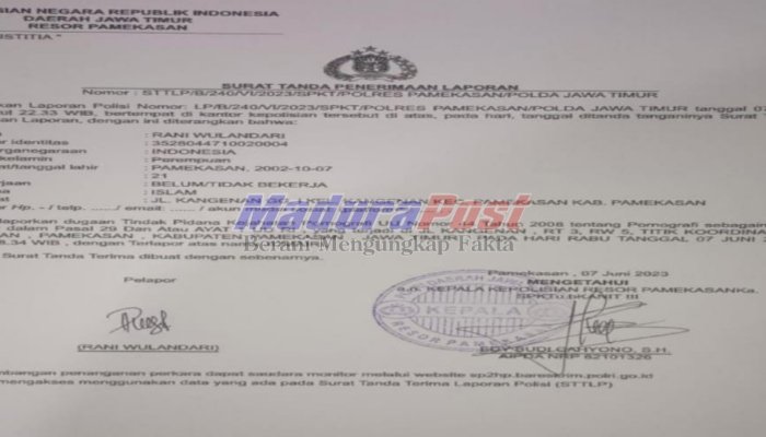 Hal itu diketahui berdasarkan Surat Tanda Penerimaan Laporan dari pihak Polres Pamekasan pada tanggal 7 Juni 2023 dengan nomer Laporan Polisi: LP/B/240/VI/2023/SPKT/POLRES PAMEKASAN/POLDA JAWA TIMUR.