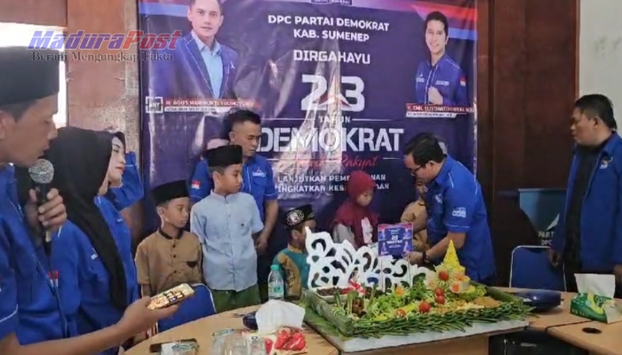 SUMENEP, MaduraPost – DPC Partai Demokrat Sumenep, Madura, Jawa Timur, melangsungkan peringatan HUT ke-23 partai politik besutan Susilo Bambang Yudhoyono itu dengan menyantuni puluhan anak yatim dan potong tumpeng bersama para kader.