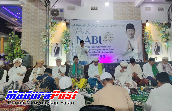 SAMPANG, MaduraPost – Sebagai implementasi rasa cinta dan rindu kepada baginda Nabi Muhammad SAW, Politisi Partai Amanat Nasional (PAN), Slamet Ariyadi menggelar acara maulid Nabi yang dilaksanakan dikediamannya, Desa Masaran, Kecamatan Banyuates, Sampang. Ahad (30/10/22).