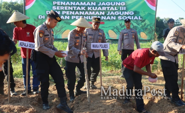 PAMEKASAN, MaduraPost – Polres Pamekasan menunjukkan komitmennya dalam mendukung ketahanan pangan nasional dengan menggelar aksi penanaman jagung serentak di Desa Durbuk, Kecamatan Pademawu, Kabupaten Pamekasan, Rabu (9/7/2025).