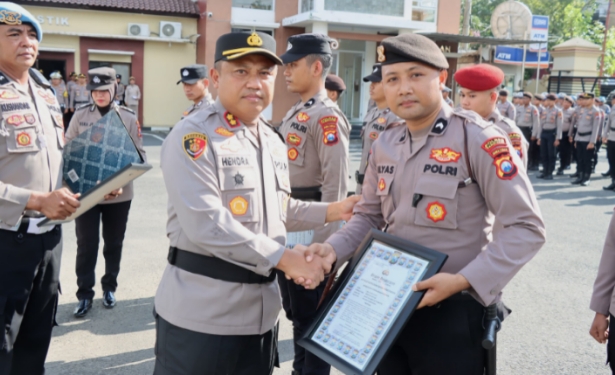 Kapolres Pamekasan, AKBP Hendra Eko Triyulianto, memberikan penghargaan kepada 10 anggota Polres Pamekasan yang berprestasi dalam acara tersebut.