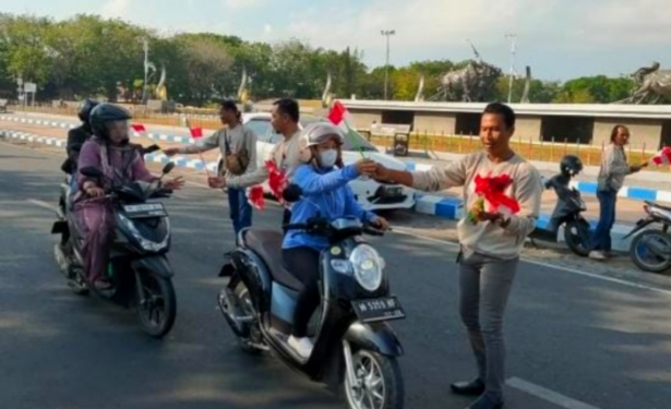 Salah satunya dengan membagikan ratusan bendera merah putih kepada pengendara roda dua dan roda empat di Alun-Alun Trunojoyo, Sampang, Sabtu (17/8/2024).
