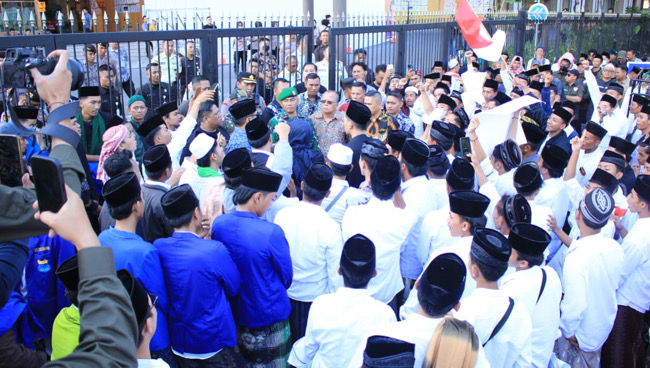Aksi sempat diwarnai pemukulan beduk simbolik oleh peserta demonstrasi sebagai tanda peringatan moral. “Ini gendang perang,” teriak salah satu orator dari atas mobil komando, namun mereka memastikan aksi tetap berlangsung damai.