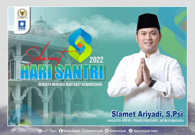 Dengan ucapan Selamat Hari Santri Nasional 2022, Slamet Mengajak kepada kaum santri untuk terus berkarya untuk Indonesia. Dengan ucapan “Inna fii yadil fataa, amru hadzihil ummah, Wafii iqdamikum, Hayatuhaa, (Sesungguhnya setiap perkara ada ditangan generasi muda, dan Kebangkitan generasi muda menjadikan Indonesia Jaya),”. Tutur Slamet yang juga alumni santri Pondok Pesantren Nazhatut Thullab, Prajjan, Sampang.