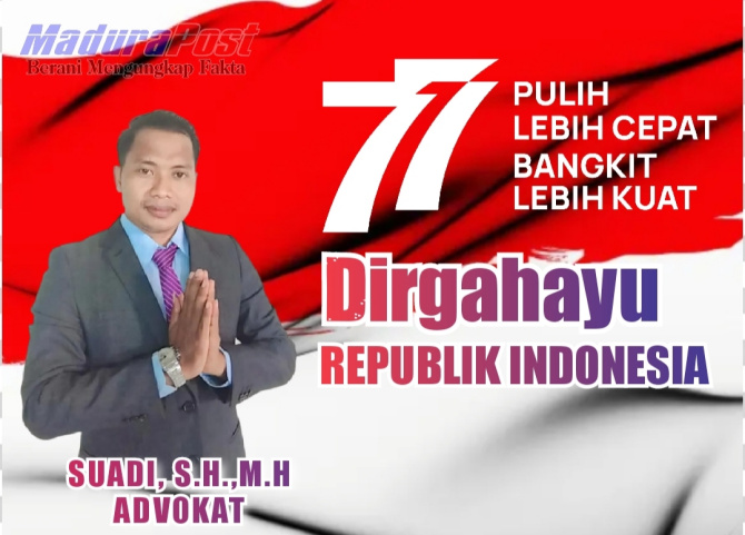 SAMPANG, MaduraPost – Advokat muda dari Kecamatan Sokobanah, SUADI, S.H., M.H Mengucapkan Selamat Hari Kemerdekaan Republik Indonesia ke 77. Rabu 17 Agustus 2022.